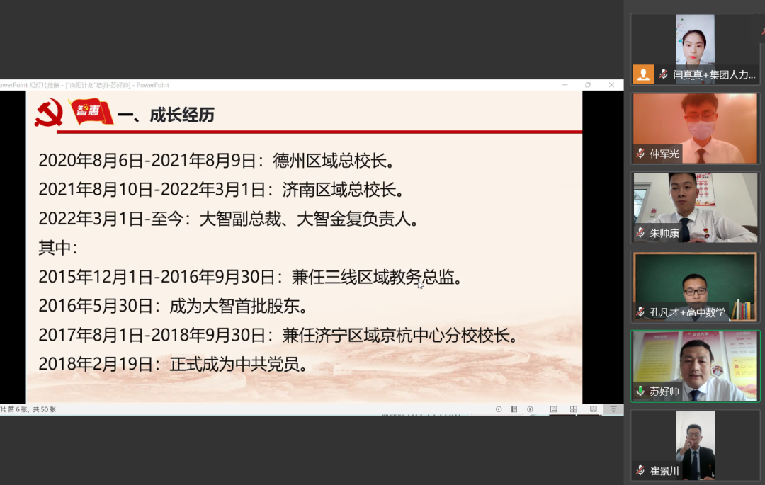 4月29日,大智控股集團(tuán)副總裁蘇好帥為大智黨員們帶來(lái)了2021-2022財(cái)年“向陽(yáng)計(jì)劃”專項(xiàng)培訓(xùn)第五講精彩內(nèi)容分享——《不忘初心 方得始終》。黨員通過(guò)視頻連線方式參加培訓(xùn)。