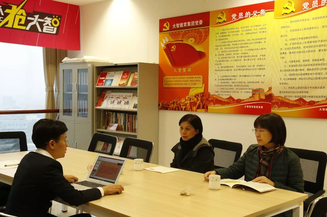 黨建長(zhǎng)廊、團(tuán)建長(zhǎng)廊、主題形象墻,李靜、張芳一行一一參觀了大智總部。