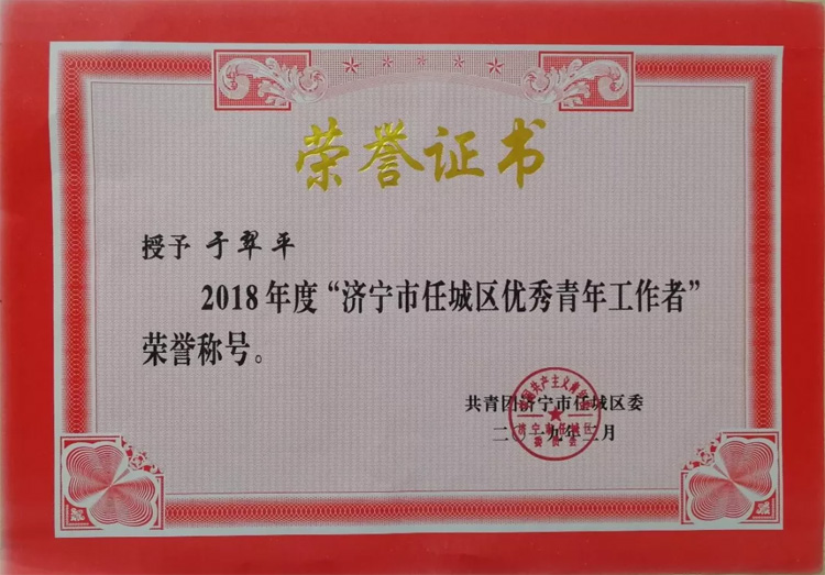 近日,大智濟寧區(qū)域團總支被共青團濟寧市任城區(qū)委評為“濟寧市任城區(qū)紅旗團總支”,團總支書記于翠平被評為“2018年度濟寧市任城區(qū)優(yōu)秀青年工作者”。