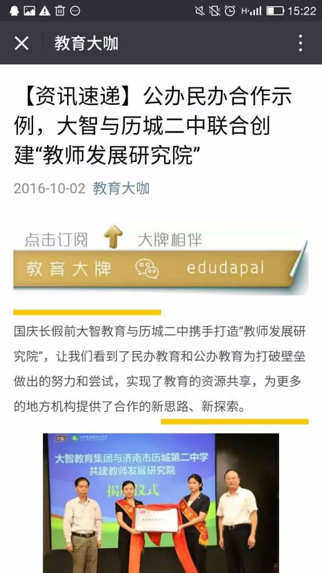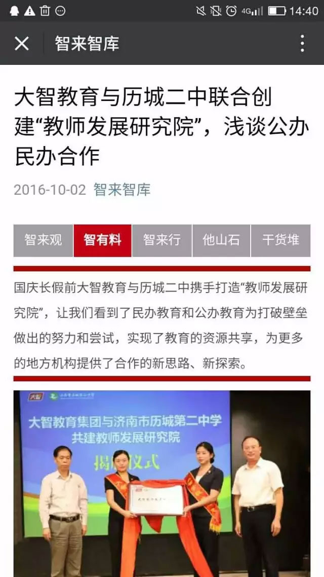09月30日,大智與濟(jì)南市歷城第二中學(xué)在山東新聞大廈舉辦“聯(lián)合共建教師發(fā)展研究院”揭牌儀式,開啟了民辦教育與公辦學(xué)校攜手共建的新模式。消息一出,各大媒體爭(zhēng)相報(bào)道,贊譽(yù)之聲從四面八方不斷傳來。