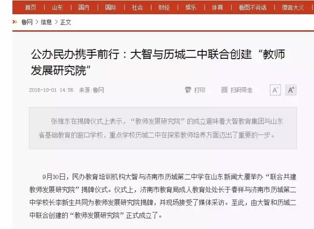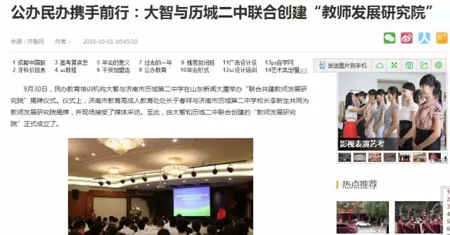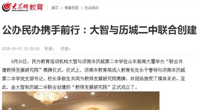 10月01日,《生活日?qǐng)?bào)》08版,發(fā)文指出,大智與歷城二中合建“教師發(fā)展研究院”開創(chuàng)了民辦教育與公辦教育合作新模式,為教育培訓(xùn)機(jī)構(gòu)探索出新路子,是教育改革的重大突破。