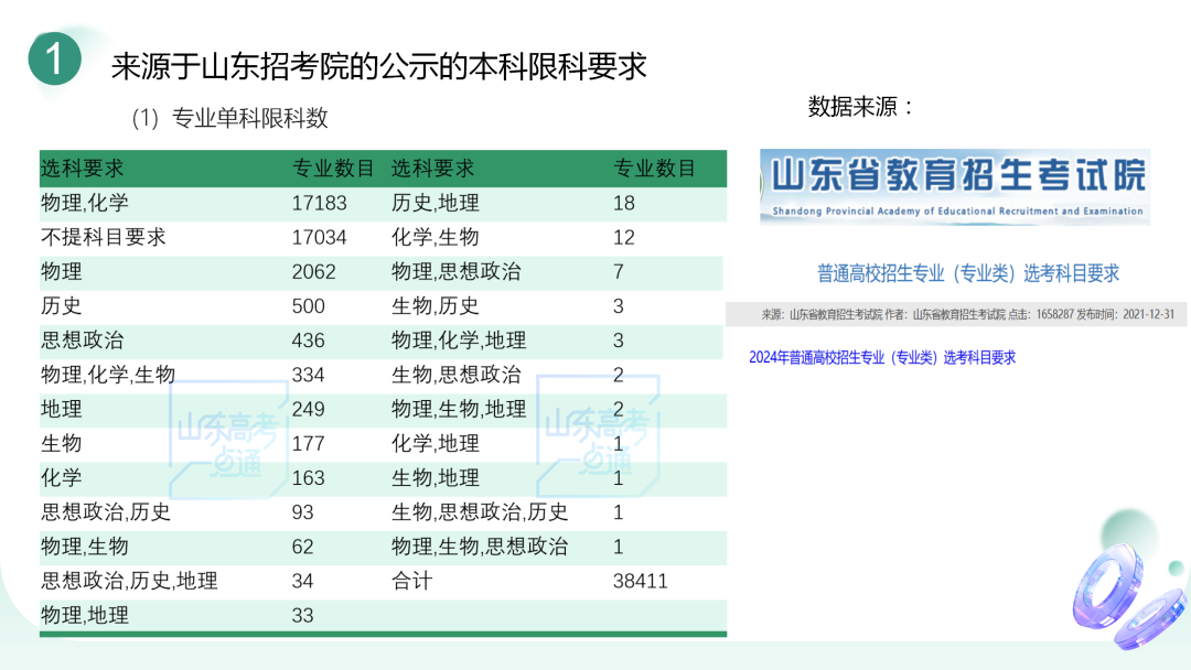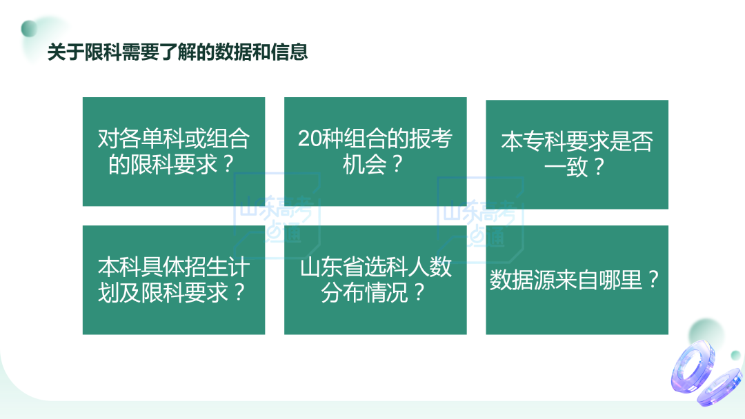 從圖中我們可以了解到,關(guān)于限科需要了解的數(shù)據(jù)和信息包含了六大方面,比如:相關(guān)大學和專業(yè)對各單科或組合有怎樣的限科要求,20種科目組合的報考機會是怎樣的,本科和??茖W校及專業(yè)對限科的要求是否一致,本科具體的招生計劃以及限科要求是怎樣的情況,山東省選科人數(shù)的分布情況,另外就是很多數(shù)據(jù)都是經(jīng)過數(shù)據(jù)源的分析,我們的家長要了解數(shù)據(jù)源來自哪里,我們要掌握到第一手資料,然后有針對性地去看一看,才能夠更加確信相關(guān)的內(nèi)容。