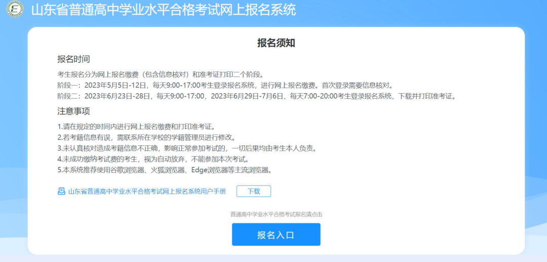 參加山東省2023年冬季普通高中學(xué)業(yè)水平合格考試(以下簡稱冬季合格考)的考生須于10月19日—26日每天9:00—17:00,登錄報名系統(tǒng)進(jìn)行信息核對,信息核對無誤后直接進(jìn)行網(wǎng)上選科繳費(fèi)。繳費(fèi)成功方視為報名完成,否則視為未報名成功,不能參加本次考試。