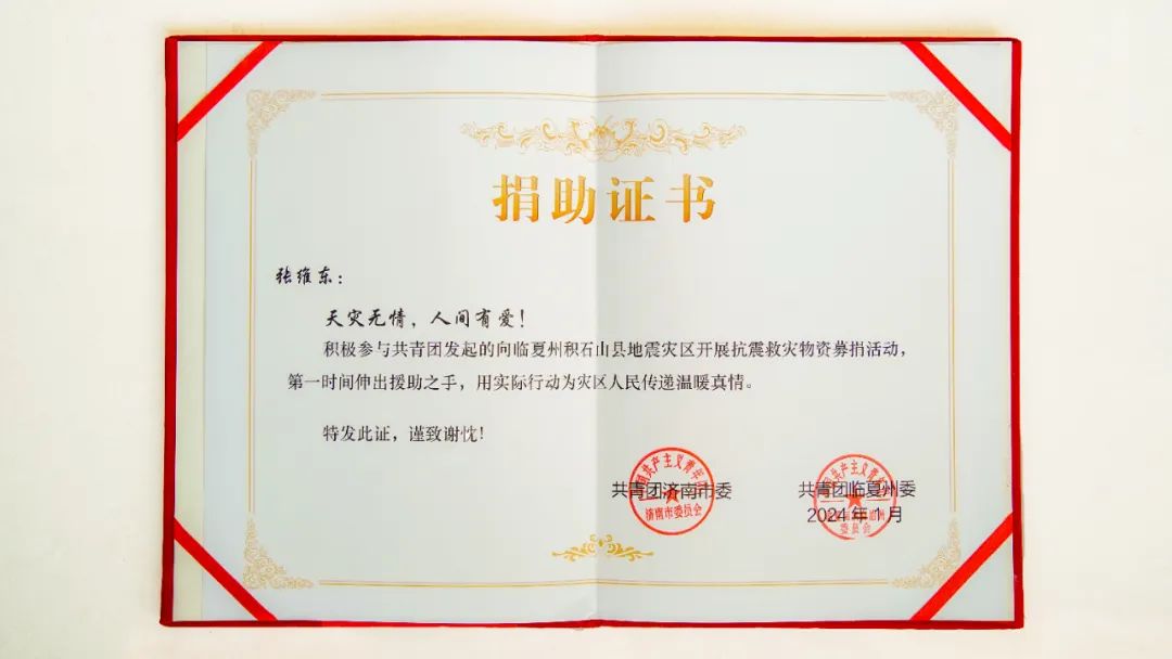 張維東獲評東西部協(xié)作和援助甘肅積石山縣地震災區(qū)工作作出積極貢獻的青年企業(yè)家