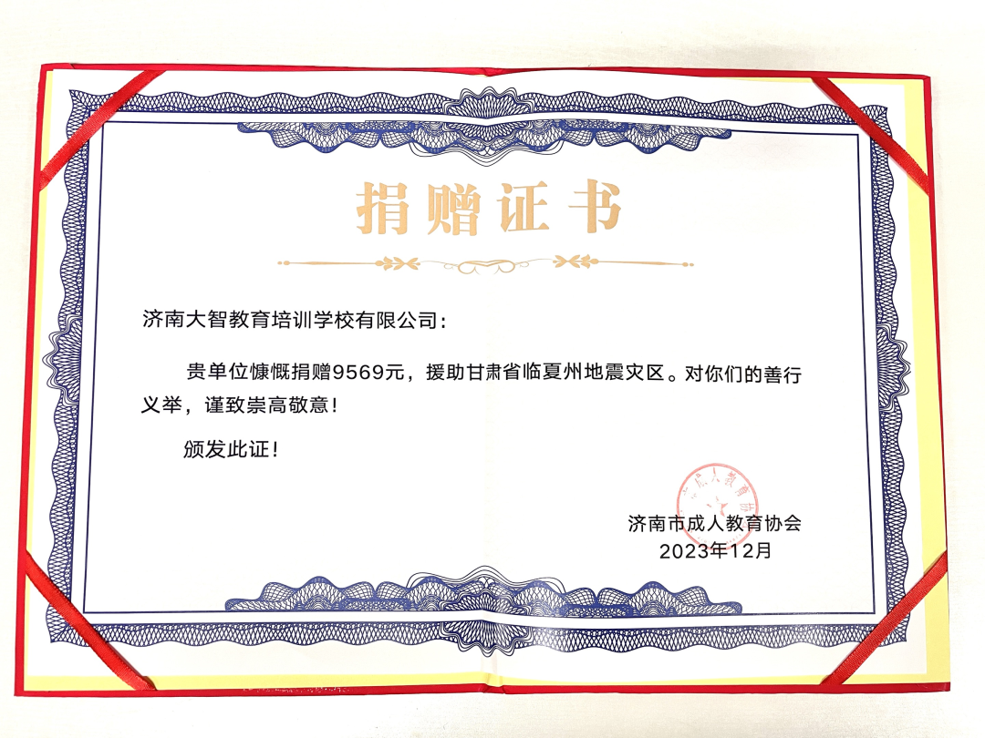 據(jù)悉,甘肅省臨夏州發(fā)生地震災害,造成了大量人員傷亡和財產(chǎn)損失。濟南市成人教育協(xié)會聯(lián)合濟南報業(yè)集團泉城義工總站、教育事業(yè)中心、濟南市教育培訓行業(yè)團工委共同發(fā)起濟南市教培行業(yè)愛心捐贈行動倡議。接到倡議后,大智金復立刻行動,積極捐款,用綿薄之力幫助災區(qū)人民重建美好家園。