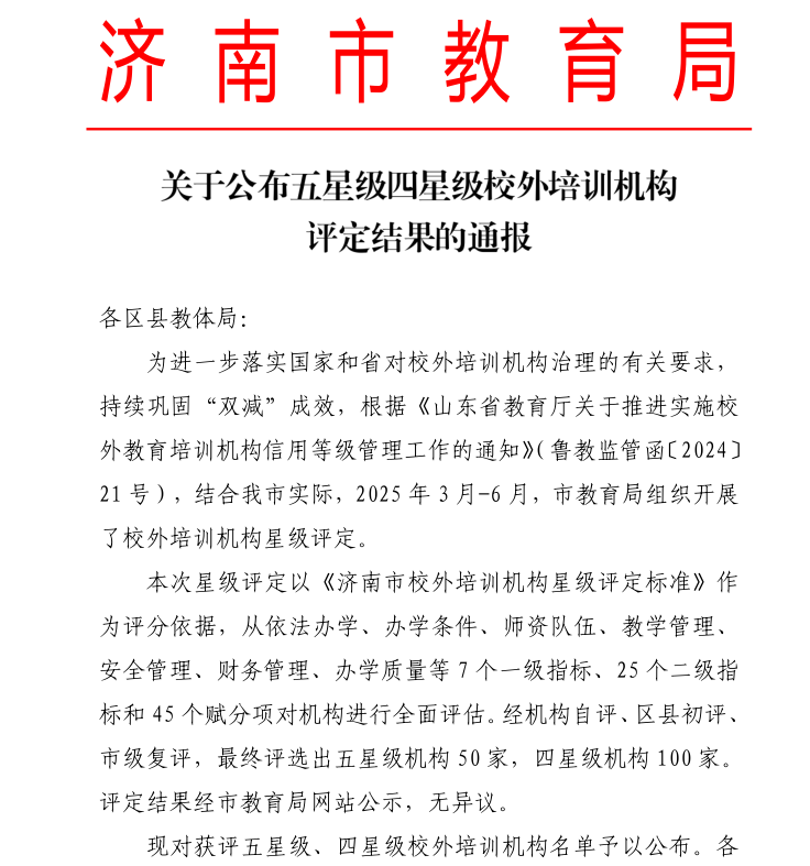 近日,濟南市教育局發(fā)布《關(guān)于公布五星級四星級校外培訓機構(gòu)評定結(jié)果的通報》,大智12所分校憑借規(guī)范辦學、優(yōu)質(zhì)服務(wù)和卓越教學成果上榜,彰顯了深耕...