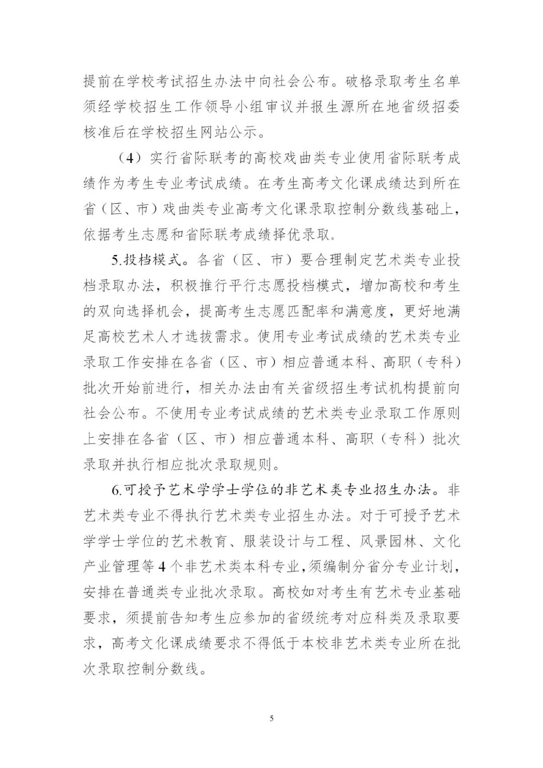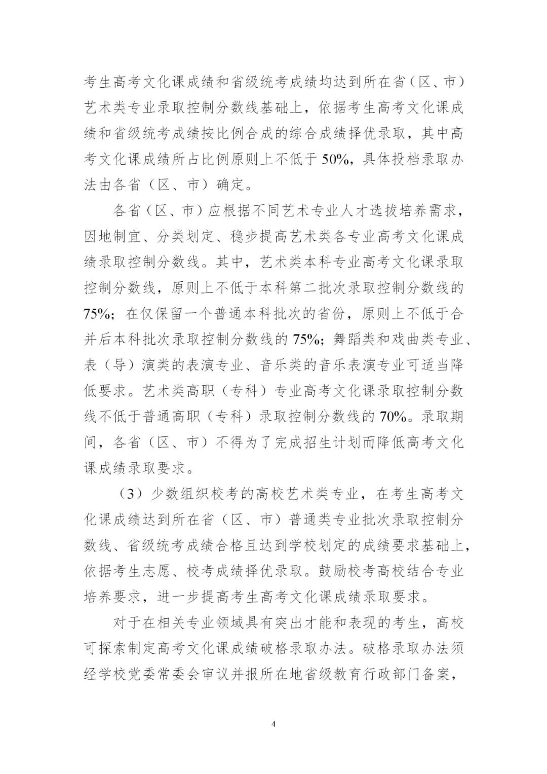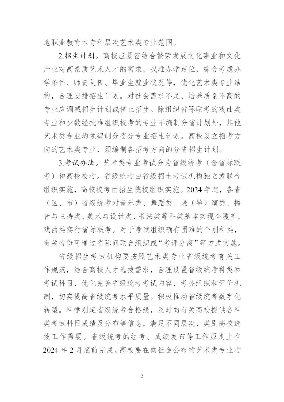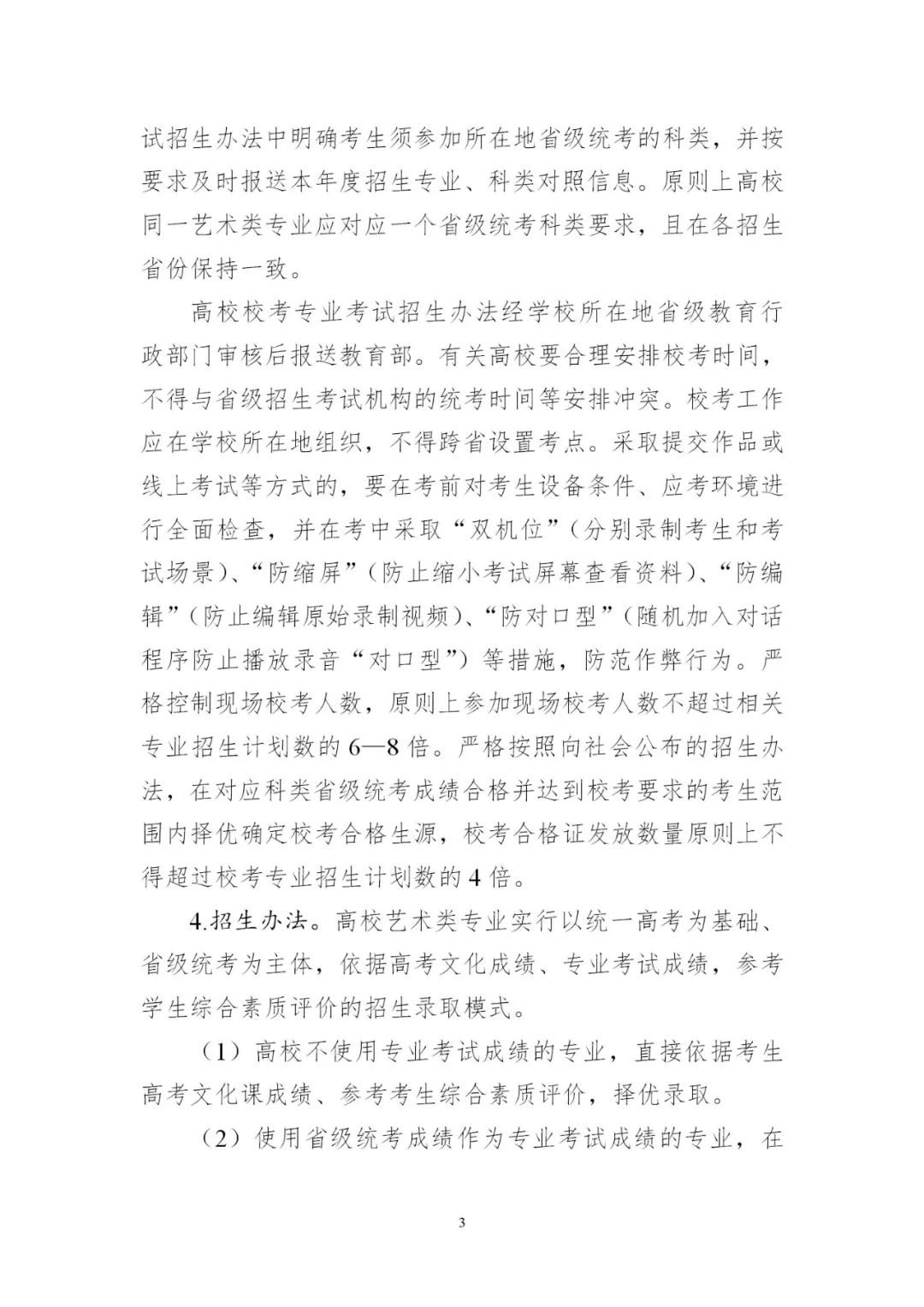 3.平穩(wěn)做好藝術類考試招生。各地要認真落實藝術類專業(yè)考試招生改革部署,進一步加強省級統(tǒng)考能力建設,考試科類基本實現(xiàn)全覆蓋。要對照有關工作規(guī)范,完善省級統(tǒng)考科目和內(nèi)容,優(yōu)化考試組織和流程,推進省級統(tǒng)考提質(zhì)增效。要科學制定藝術類專業(yè)招生錄取辦法,確保改革平穩(wěn)落地。少數(shù)專業(yè)特色鮮明、人才培養(yǎng)質(zhì)量較高的藝術院校,經(jīng)省級教育行政部門批準可在省級統(tǒng)考基礎上組織個別專業(yè)???。有關高校要結合人才培養(yǎng)定位,科學制定??紝I(yè)考試招生辦法,加強與省級統(tǒng)考銜接,合理確定校考形式及內(nèi)容。2024年起,高校高水平藝術團不再從高校招生環(huán)節(jié)選拔,由有關高校從在校生中遴選培養(yǎng)。