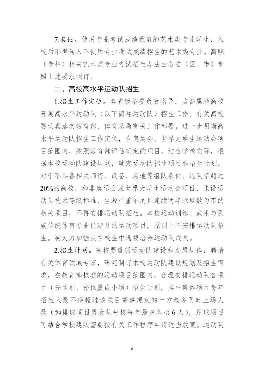 通知要求,各地和有關高校要加強特殊類型考試招生工作的組織領導,認真落實主體責任和監(jiān)管責任,優(yōu)化招考辦法,推動藝術類專業(yè)和高水平運動隊考試招生更加科學規(guī)范。進一步加強藝術類專業(yè)省級統(tǒng)考能力建設,完善省級統(tǒng)考科目和內(nèi)容,考試科類基本實現(xiàn)全覆蓋;少數(shù)組織??嫉母咝R訌娦?寂c省級統(tǒng)考銜接,合理確定校考形式及內(nèi)容,科學制定招生錄取辦法。明晰高水平運動隊人才選拔培養(yǎng)定位,完善評價辦法和招生錄取機制,文化考試成績?nèi)渴褂萌珖y(tǒng)一高考成績,專業(yè)測試全部納入全國統(tǒng)考,由體育總局牽頭組織實施,不斷提高人才選拔培養(yǎng)質(zhì)量。
