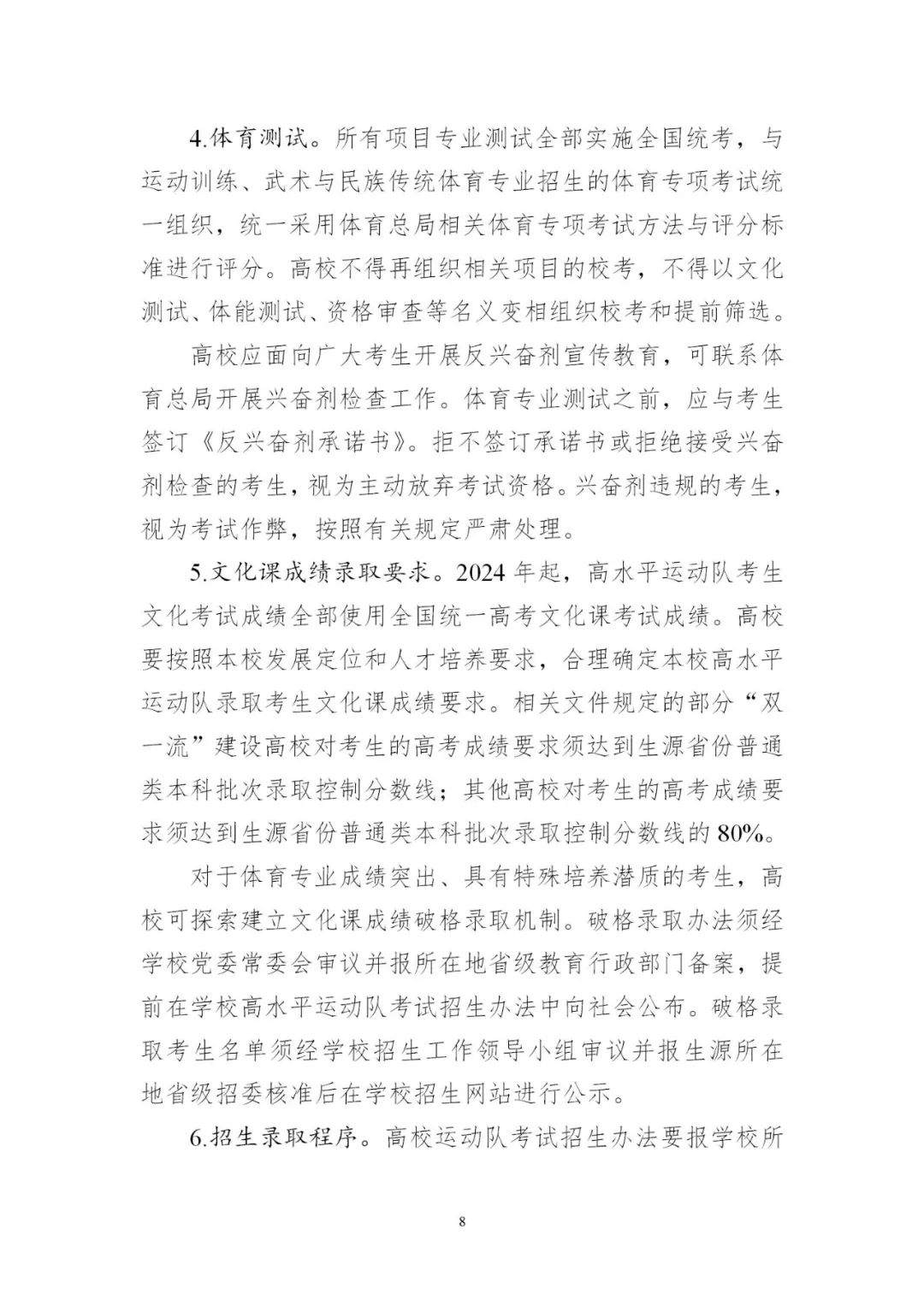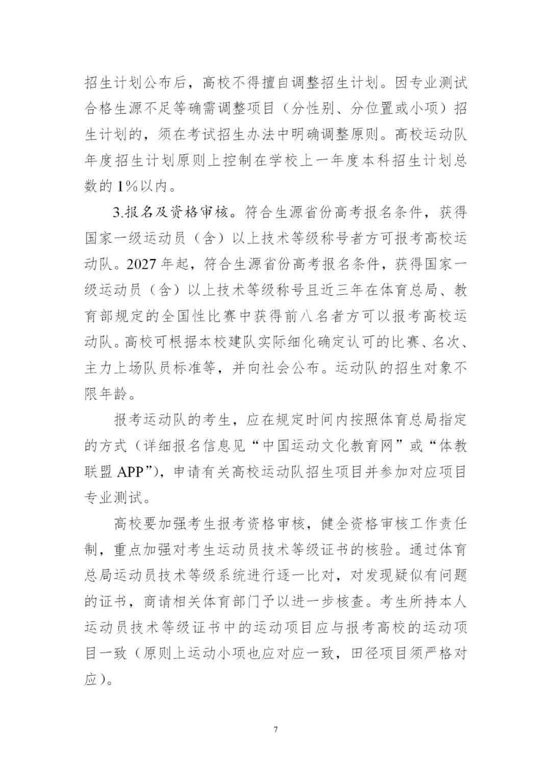 4.平穩(wěn)做好高水平運動隊考試招生。有關高校要緊緊圍繞高水平運動隊工作定位,根據(jù)學校運動隊建設規(guī)劃,優(yōu)化招生項目范圍。要嚴格招生程序,完善評價辦法和招生錄取機制,合理確定文化成績要求。2024年起,高水平運動隊考生文化考試成績?nèi)渴褂萌珖y(tǒng)一高考文化課考試成績;專業(yè)測試全部納入全國統(tǒng)考,由體育總局牽頭組織實施,高校不再組織相關???。
