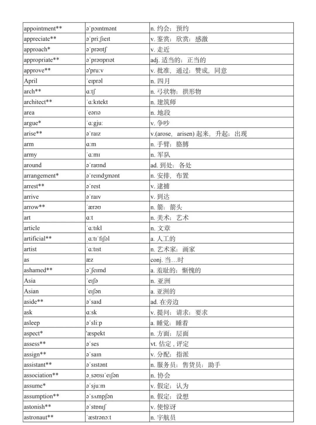 本詞匯表共收 3000 個(gè)單詞,含義務(wù)教育階段要求掌握的 1500 個(gè)單詞。高中英語必修課程應(yīng)學(xué)習(xí)和掌握 500 個(gè)單詞(表中加有一個(gè) * 號(hào)),累計(jì)達(dá) 2000。選擇性必修課程應(yīng)學(xué)習(xí)和掌握 1000 個(gè)單詞(表中加有兩個(gè) *號(hào)),累計(jì)達(dá) 3000。各地可根據(jù)實(shí)際情況在本詞匯表所收詞的基礎(chǔ)上,再選擇增加 200 個(gè)單詞。