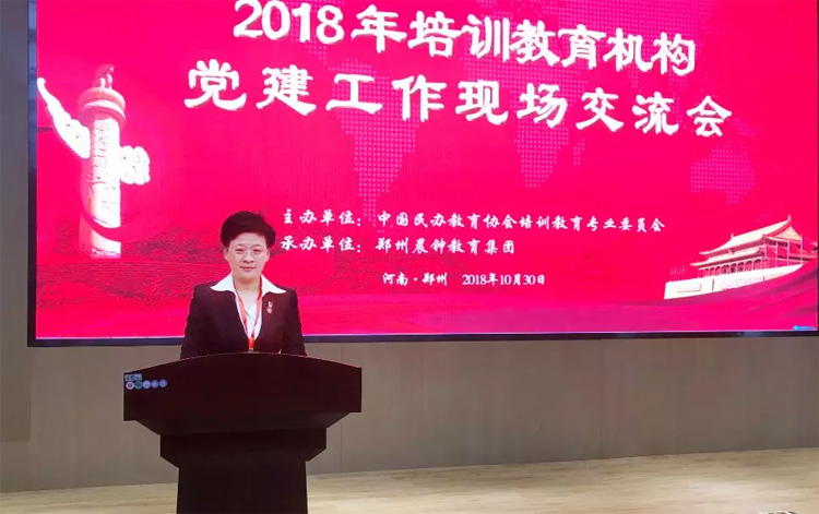 10月30日,由中國民辦教育協(xié)會(huì)培訓(xùn)教育專業(yè)委員會(huì)主辦的2018年培訓(xùn)教育機(jī)構(gòu)黨建工作現(xiàn)場(chǎng)交流會(huì)在鄭州舉行。中國民辦教育協(xié)會(huì)會(huì)長(zhǎng)王佐書等各級(jí)領(lǐng)導(dǎo)蒞臨大會(huì),來自全國20個(gè)省市近100家培訓(xùn)教育機(jī)構(gòu)的200余名黨務(wù)工作者參會(huì)。大智控股集團(tuán)黨委書記王現(xiàn)芹現(xiàn)場(chǎng)做典型發(fā)言,分享大智黨建經(jīng)驗(yàn)成果。