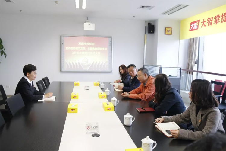 03月28日,市扶貧辦宣傳信息組黨支部書記張婉,市扶貧辦金融合作組黨支部書記徐磊一行7人蒞臨大智開展03月主題黨日活動,大智控股集團黨委書記王現(xiàn)芹熱情接待。