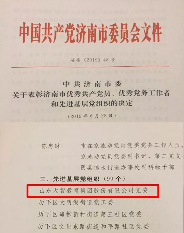 此次被評為“濟南市先進基層黨組織”將激勵大智控股集團黨委再接再厲,不斷提升黨建工作質量和水平,努力在引領改革發(fā)展,推動做大做強中當先鋒、做表率,為濟南市建設“大強美富通”現(xiàn)代化國際大都市作出積極貢獻。